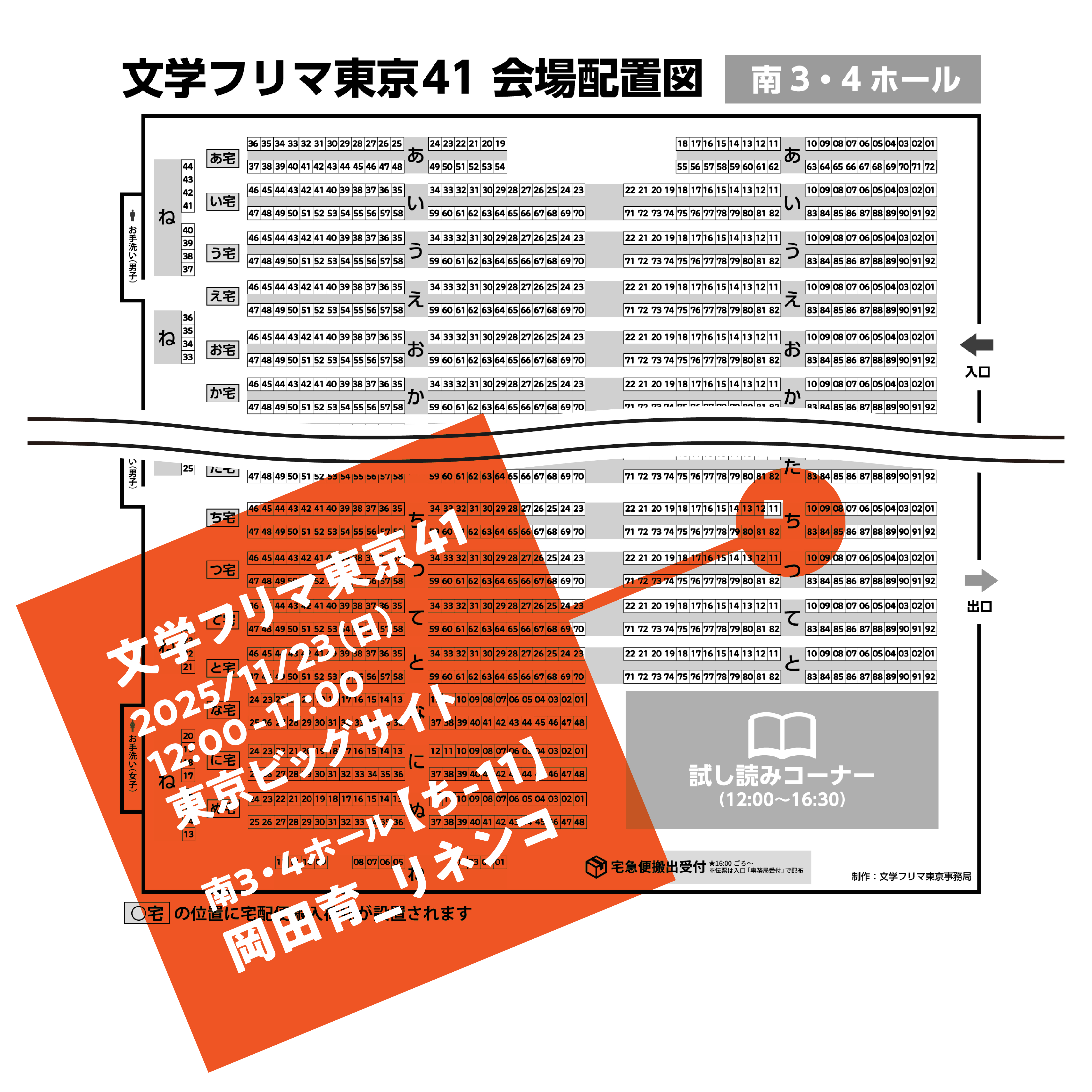 最後の最後の告知となります。明日2025年11月23日(日)、東京ビッグサイトにて開催される「文学フリマ東京41」に出店します。ブース番号は【ち-11】です。まだ迷われている方、明日になっても当日券をお求めいただくことが可能なので、どうぞこちらをご覧ください。